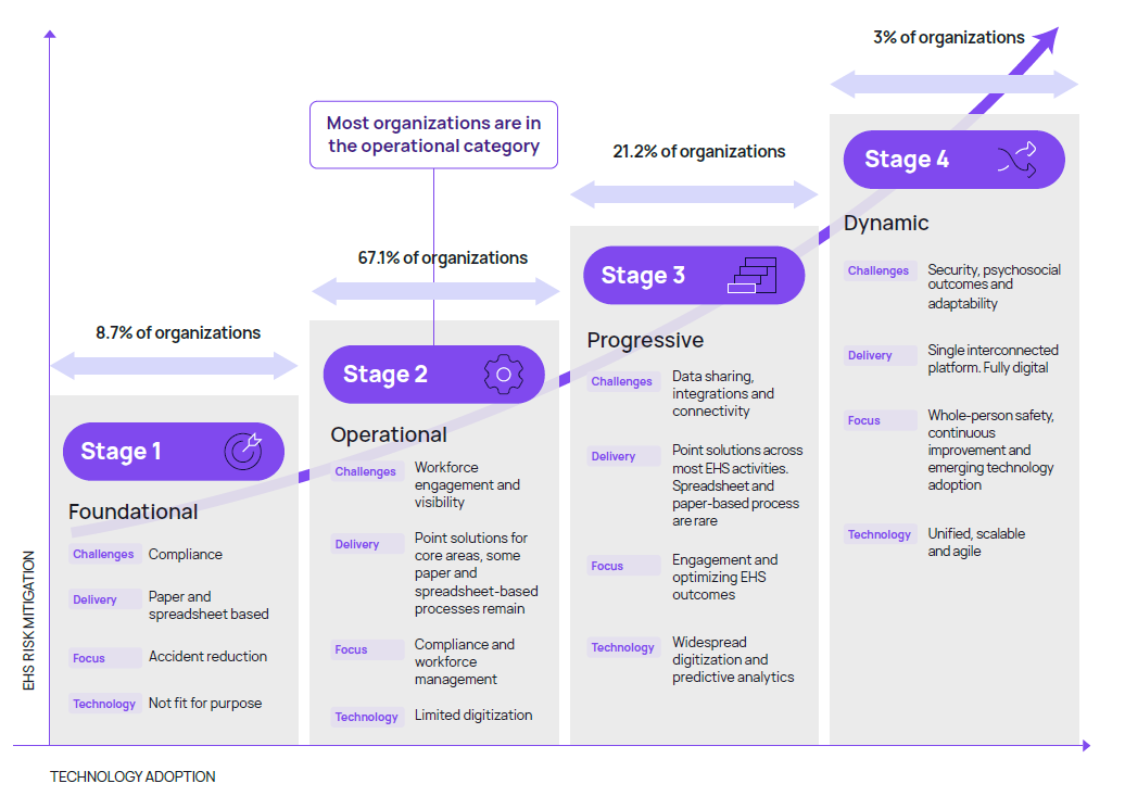 Why do these numbers matter? They are key indicators into an organization’s ability to keep their workers and company safe while operating efficiently. To break it down further, lower EHS maturity often translates to reactive safety measures, higher incident rates, and lapsed compliance, which can impact an organization’s bottom line and reputation.