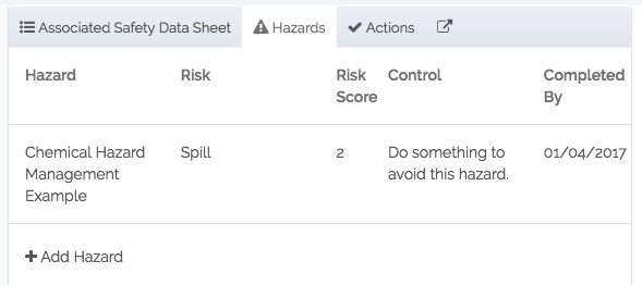 From the screenshot above you can already see there are some big improvements. Donesafe by default now stores a library in line with the Global Harmonised Standard. You can also see that a Hazards tab is also available; meaning that you can now quickly and easily create hazards and controls for each chemical in each location, right there from the record.