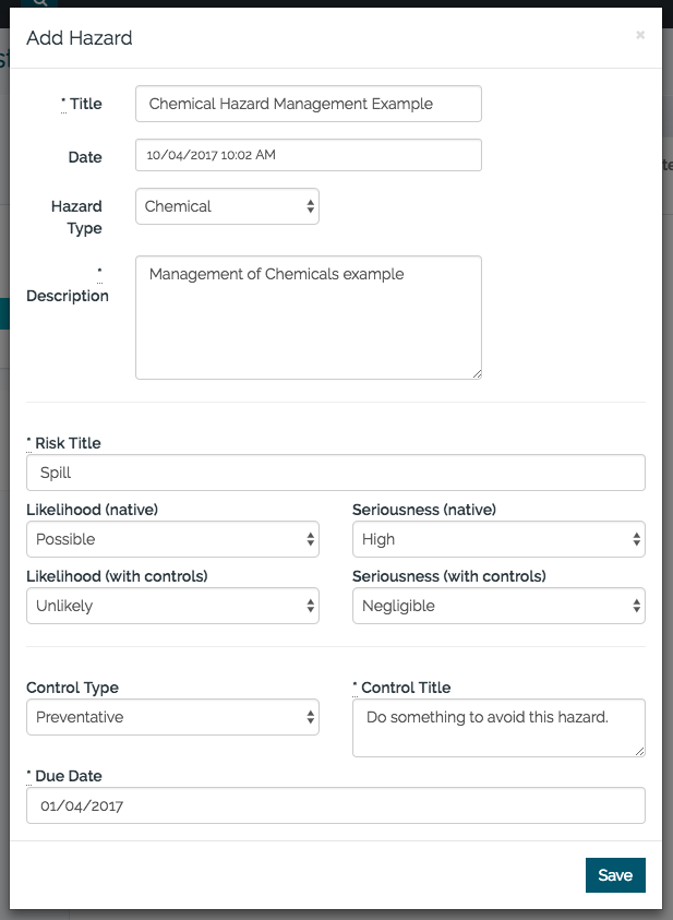 If the hazard requires any additional risks or controls, you can click on the hazard title record then add in risks and controls like you would with any other hazard, as outlined in this video. If there are any additional Hazards to add, simply click the [+Add Hazard] button again. You can see my poorly thought out the example below.