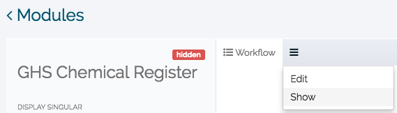 To enable both modules, go to Settings > Modules. Locate the modules (‘Safety Data Sheet Register’ AND ‘GHS Chemical Register’ and click through. Once there, click on the menu button and click ‘Show’.