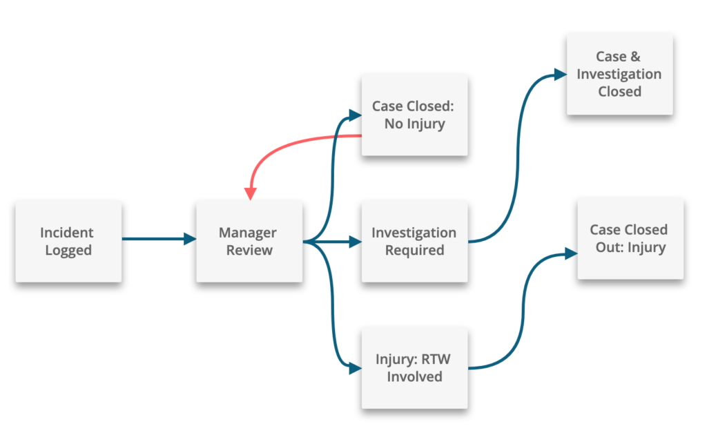 - Split the workflow – splitting a workflow enables managers to triage relevant records based on a review. For example, after a manager reviews an incident, they can select to either close it out, initiate an investigation, or involve the Return to Work Coordinator.