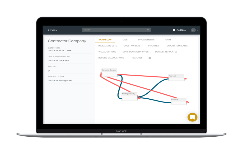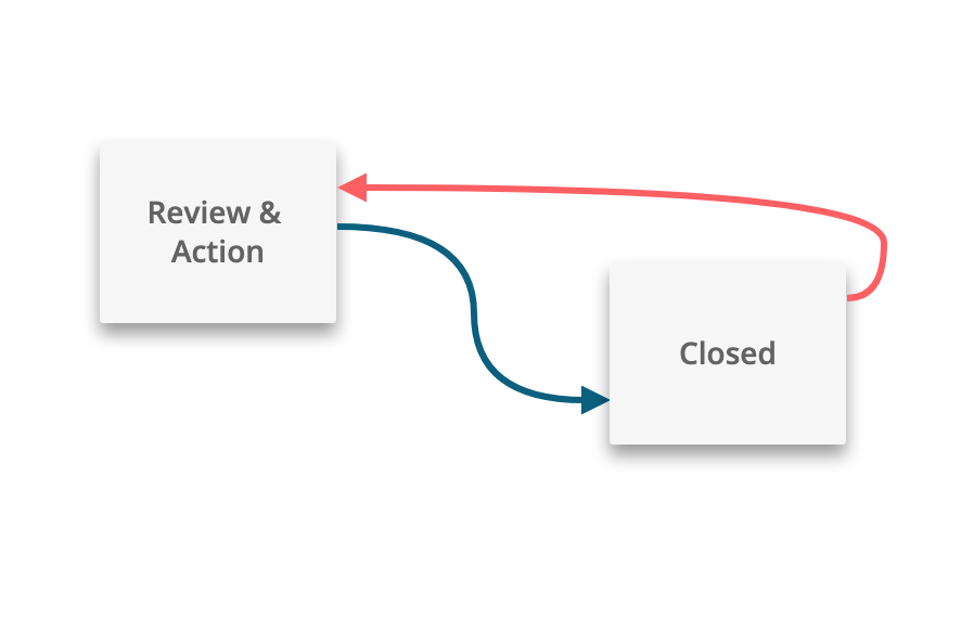 - Configurable workflow connectors – each step in the workflow can be configured via red or blue connectors. Blue means the workflow can only advance/go forward; red means a record can move both backwards and forwards. (You might have red connectors to enable a manager to reject a record or require updates before advancing to the next stage).