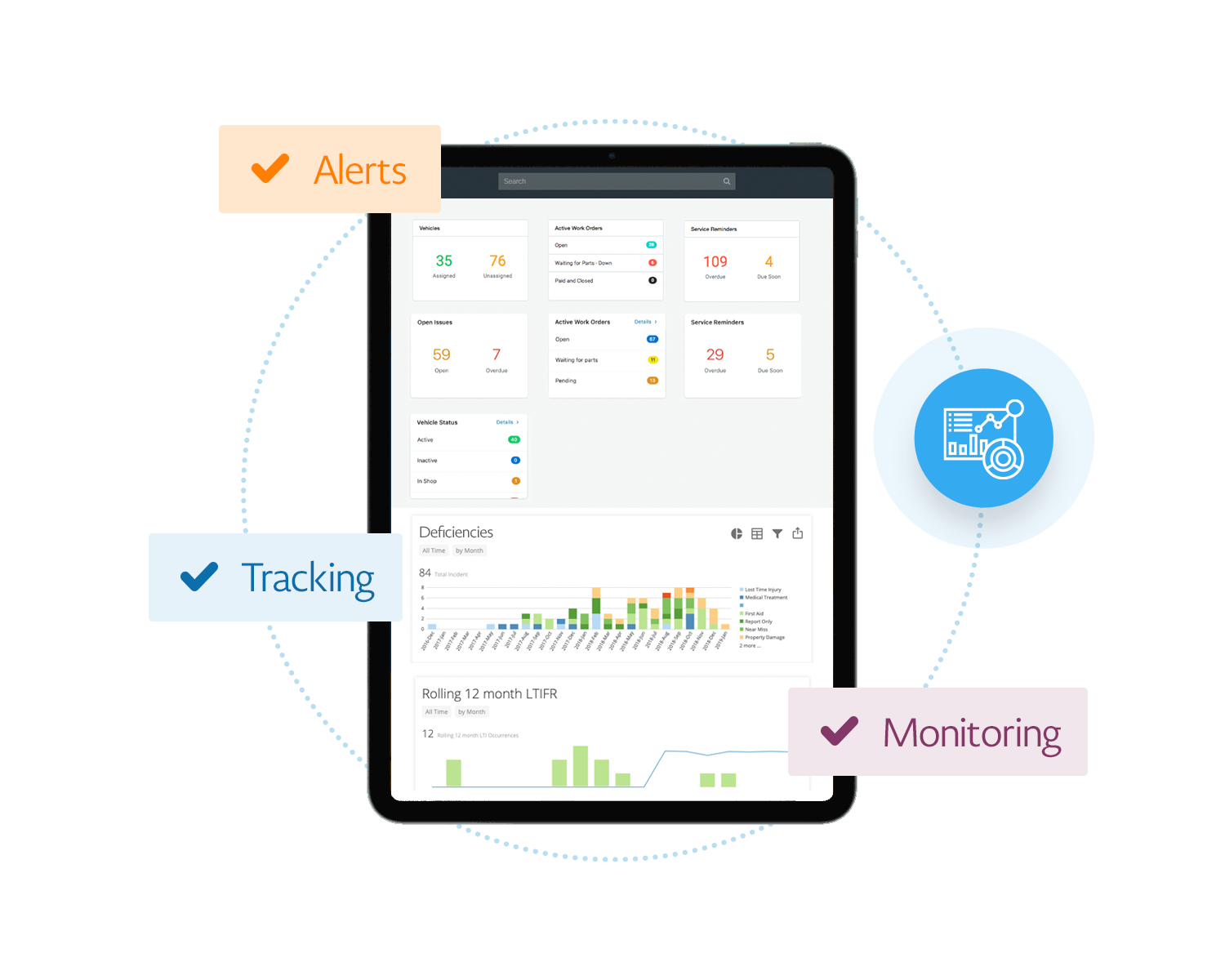 Harness global visibility and control all in one place with configurable reports & widgets. Role-specific views let every department focus on the metrics, actions, and tasks that matter most. Track team progress, status, events & more. Get real-time visibility to Vehicle status, Maintenance Alerts, Deficiencies, Vehicle inspections, Vehicle and Driver information.